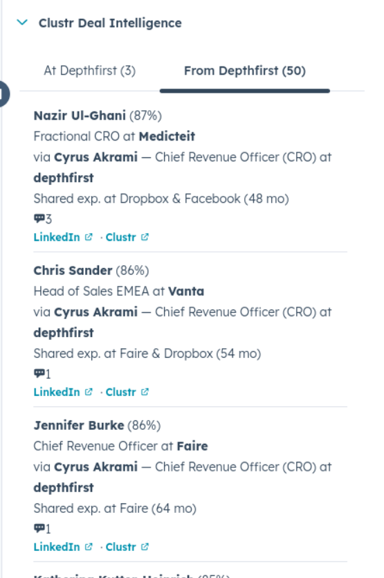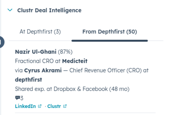 Contacts and companies in HubSpot are automatically matched to your Clustr network via domain and LinkedIn URL. Their latest CRM activity is shown alongside relationship data. Each card shows:- A confidence score for each referral path
