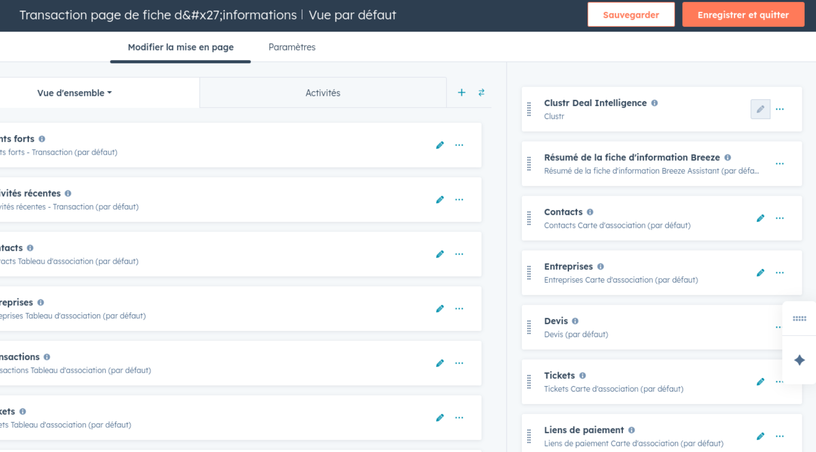 After connecting, you need to add the Clustr cards to your HubSpot record layouts. This is a one-time setup; repeat for deals, contacts, and companies.Open the layout editor
