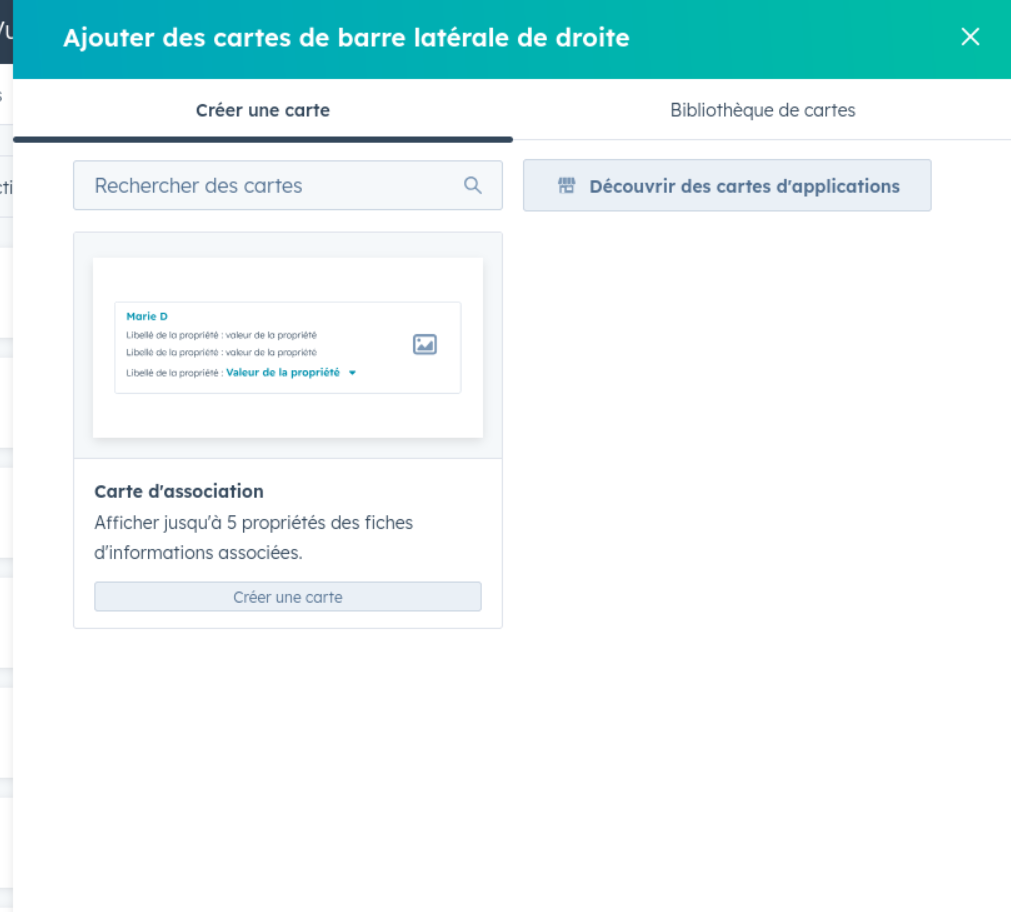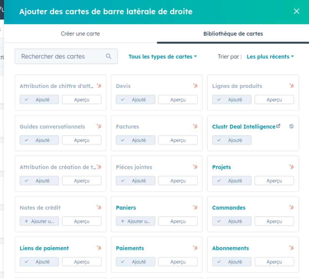 Open any deal (or contact, or company) in HubSpot. In the top right, click Customize record. You’ll see the existing cards listed in the right sidebar.